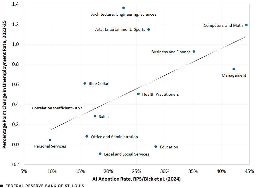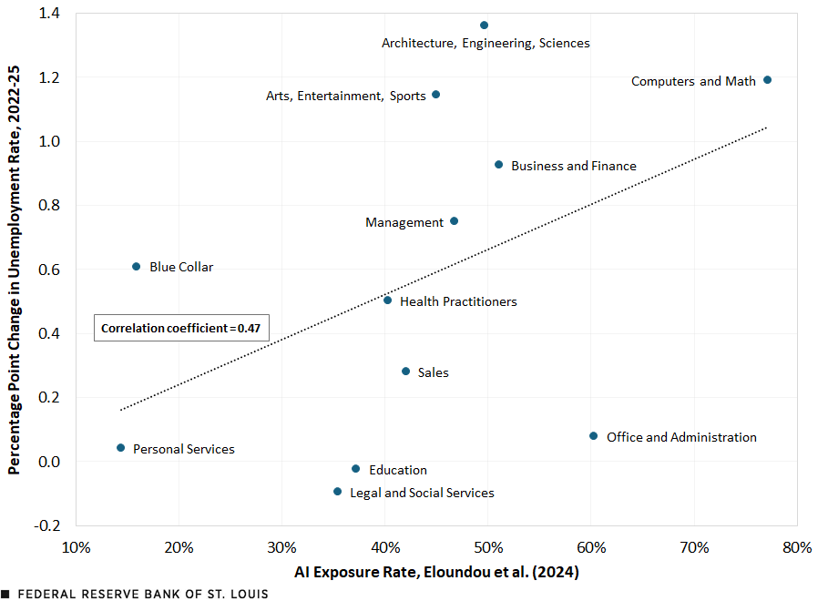 Các nhà kinh tế học từ ngân hàng dự trữ liên bang ở St. Louis cũng có bài nghiên cứu chỉ ra sự tương quan (chưa rõ ràng) giữa mức độ phơi nhiễm từ AI trong việc làm với mức độ đón nhận AI thực tế.